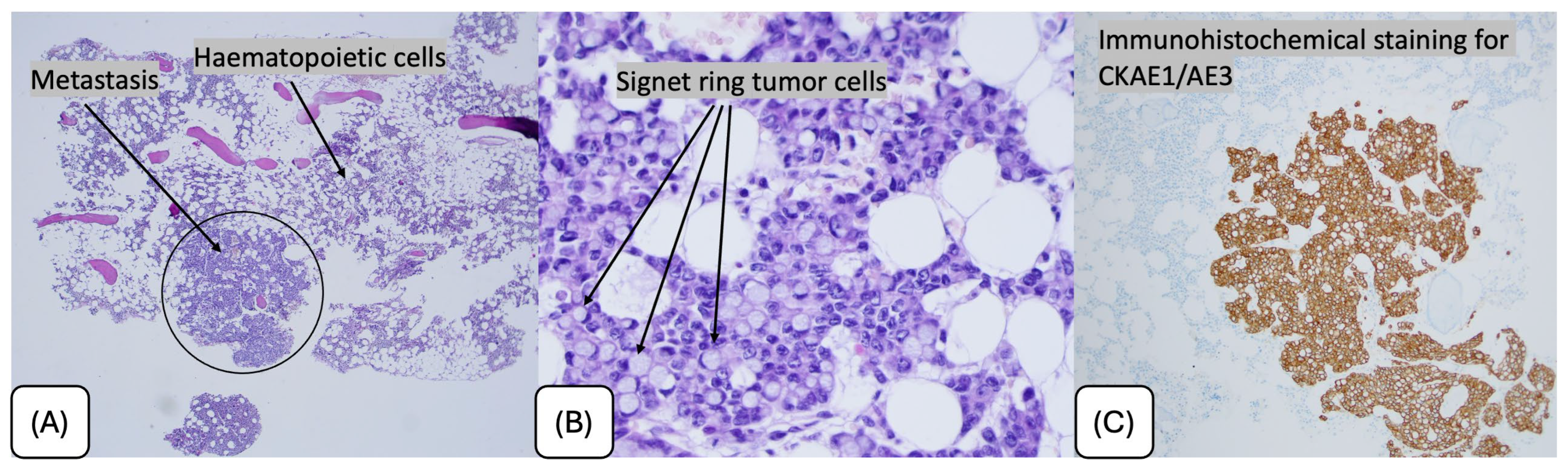- Wang, S.; Wang, H.; Sui, P.; Han, B. Gastric Signet-Ring Cell Carcinoma with Paraneoplastic Eosinophilia: A Case Report and Literature Review. Oncol. Transl. Med. 2022, 8, 264–266. [Google Scholar] [CrossRef]