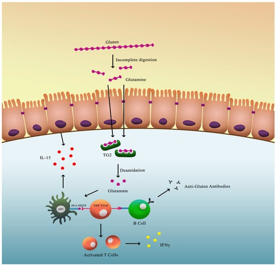 Once these peptides breach the intestinal barrier, they undergo deamidation by the enzyme tissue transglutaminase 2 (TG2), converting specific glutamine residues into glutamate. This modification increases the peptides’ binding affinity for HLA-DQ2 or HLA-DQ8 molecules, enhancing T-cell activation within the lamina propria of the small intestine. The activated T cells release pro-inflammatory cytokines such as interferon-γ, which contribute to mucosal injury and villous atrophy (Figure 2) [13,14,15,16].