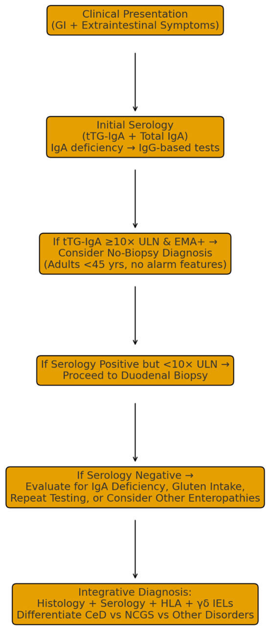 The 2025 ESsCD guidelines introduce a significant refinement in the diagnostic approach to CeD in adults. While positive CeD-specific serology (IgA anti-TG2) in conjunction with Marsh-II or Marsh-III histological lesions remains the diagnostic gold standard, a no-biopsy diagnostic pathway is now conditionally accepted in carefully selected cases [39]. Specifically, adults under 45 years of age with IgA anti-TG2 titers ≥10× the ULN may be diagnosed without duodenal biopsy, provided that the serologic result is confirmed in an independent second sample and the patient remains on a gluten-containing diet during testing [39].