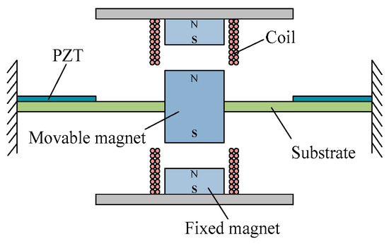 An illustration of the nonlinear hybrid PE-EM energy harvester is shown in Figure 1. The central movable magnet is supported by two identical clamped hybrid beams on both sides, and two coils are placed above and below the movable magnet, respectively. Besides this, two magnets are mounted inside the two coils, and forces between the movable magnets and fixed magnets are an attractive force, so the forces decrease the natural frequency of harvester by reducing the effective spring constant. In addition, piezoelectric layers (PZT) mounted on the top of the movable magnet are polarized in the beam thickness direction (vertical direction, shown in Figure 1), and based on piezoelectric effect and electromagnetic induction law, PZT layers and coils will output electrical energy under external excitation.