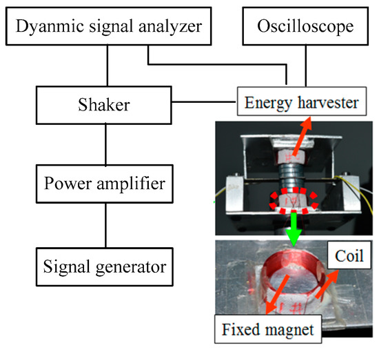 In order to test and study the output characteristics of the nonlinear PE-EM hybrid energy harvester, the designed energy harvester structure and the experimental test system are shown in Figure 2.