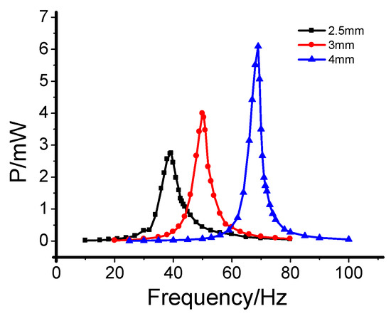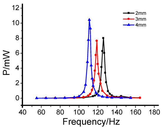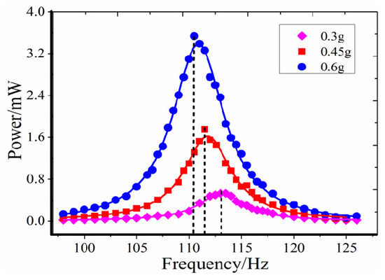 According to the test results shown in Figure 3, both the output power and the bandwidth of the energy harvester increase with the increase in the excitation acceleration. When the external acceleration is 0.3, 0.45, and 0.6 g, the maximum output power of the energy harvester is 0.52, 1.76, and 3.54 mW, respectively. At the same time, the resonant frequency of the energy harvester decreases with the increase in the excitation acceleration. As shown in in Figure 3, when the excitation acceleration increases from 0.3 to 0.6 g, the resonant frequency decreases from 113.2 to 110.5 Hz. This tells us the stiffness of this system is softening as amplitude increases.