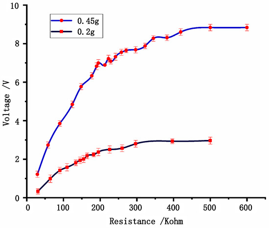 According to the results shown in Figure 6, the higher the acceleration, the higher the output voltage of the piezoelectric unit. When the excitation accelerations are 0.2 and 0.45 g, the maximum output powers of the piezoelectric unit are 0.085 and 0.5 mW and the corresponding optimal loads are 140 and 190 kΩ, respectively. Therefore, the peak load of the piezoelectric unit increases as the acceleration increases.