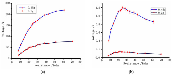 Since the peak frequency of the nonlinear hybrid energy harvester changes with the excitation acceleration, the optimal load of the energy harvester also changes. At the resonant frequency, when the acceleration is 0.2 and 0.45 g, the change of the output peak voltage and power of the piezoelectric energy harvesting unit with the piezoelectric load is as shown in Figure 6, and the electromagnetic energy harvesting unit is the optimal load at this time. The data shown in Figure 6 are averaged over several tests.