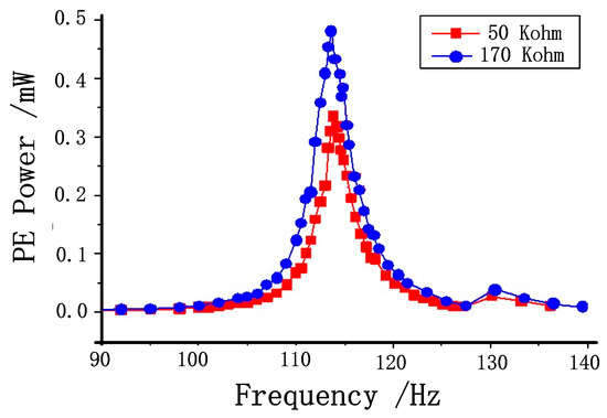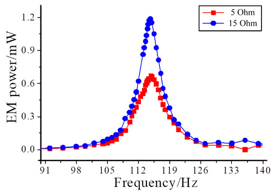 When the excitation acceleration is 0.45 g and the loads of the piezoelectric unit are 50 and 170 kΩ, the output power of the PE energy harvester unit is as shown in Figure 8. In addition, when the loads of the electromagnetic unit are 5 and 15 Ω, the output power of the EM energy harvester unit is as shown in Figure 9.