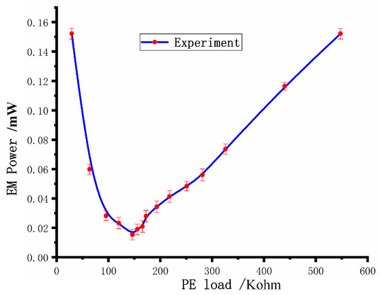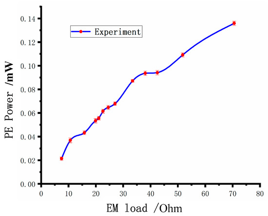 In addition, the effects of piezoelectric and electromagnetic loads on the output power of the electromagnetic unit and the piezoelectric unit are shown in Figure 10 and Figure 11. The data shown in Figure 10 and Figure 11 are averaged over several tests. The output power of the piezoelectric unit increases with the increase in the electromagnetic load, and the output power of the electromagnetic unit decreases first and then increases with the increase in the piezoelectric load, and up to the minimum value at the optimal load of the piezoelectric unit. The reason for this is that the coupling effect of the electromagnetic unit to the energy harvesting system is mainly represented by the damping effect. Therefore, the vibration amplitude of the energy harvesting system is increased, and the output power of the piezoelectric unit is increased. The output power of the piezoelectric unit is up to the maximum value when the load is the optimal load. At this time, the stiffness feedback to the energy harvesting system is maximized.