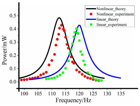 According to the results shown in Figure 10, the output power of the nonlinear energy harvester is larger than that of the corresponding linear energy harvester. Under the same excitation acceleration, the output powers are 0.44 and 0.4 mW, respectively. Due to the nonlinear magnetic force, the resonant frequency of the nonlinear energy harvester decreased, and the resonant frequency of the linear energy harvester and the nonlinear energy harvester are measured to be 119 Hz and 113.5 Hz, respectively. Therefore, the nonlinear energy harvester can increase the output power and reduce the resonant frequency, and it is more suitable for low-frequency vibration energy harvesting.