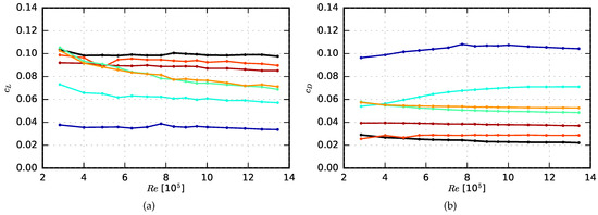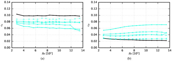 M-Pore Al 45, r = 1000 Pa·s/m2). (a) Lift coefficient as a function of chord based Reynolds number; (b) Drag coefficient as a function of chord based Reynolds number.