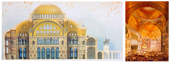 On the left: section view of Hagia Sophia from the central axis by Salzenberg [25] (p.280), on the right: interior view—an old painting [25] (p.284).