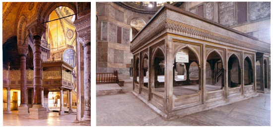 Among the Islamic additions, apart from four minarets on the exterior, a mihrab was added on the kiblah axis (the church is oriented to the east) The minbar was constructed in the same direction. Prayer carpets and banners of victory were hung on the walls during the mosque period. The Müezzin′s mahfili in the center of the structure and four more galleries in the narthex were added. On the left side of the central nave there is the preaching pulpit, that still exists. Imperial Pavilion and Imperial Loge (Figure 3) are some other additions which did not exist during the Christian period. Another significant addition of the Islamic period are the huge disks of inscriptions/calligraphies over wooden roundels with diameter of 7.6 m, which are acknowledged to be largest inscriptions in the entire Islamic world [26].