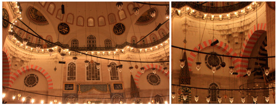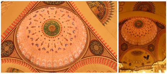 The uniqueness of the building comes from abundant sources of stone supplies delivered from various ruins of ancient cities all over the world [34]. For its original state, other basic interior materials are plaster and paint on brick, tile, ceramic pots, glass, and wood. The interior walls are faced with stone revetments. The ceilings of the pulpits and the royal box, the domical superstructure, and the pendentives are painted (Figure 5). In contrast to lavishly painted domes and pendentives in lower zones the stone revetments left relatively bare. The prominent architectural features of the interior are historical columns, marble panels, porphyry discs, great arches, mihrab, minbar (pulpit) and royal box, stained glass windows, and inscriptions.