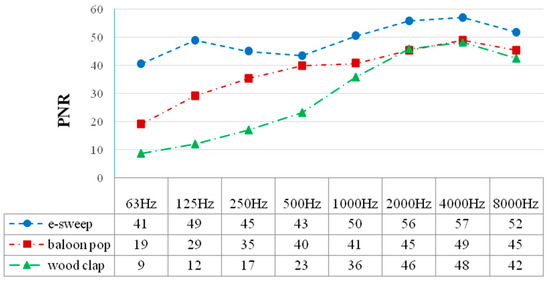 Hagia Sophia PNR measurements in 1/1 octave bands in Hz; comparison of e-sweep, balloon pop, and wood clap source signals.