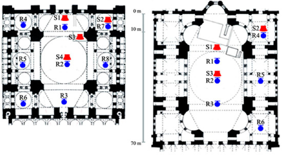 The measurement positions of field tests are represented in Figure 8, in which the sizes of each structure in relation to one another can also be compared on the plan scheme. Major source locations in Süleymaniye Mosque are one in front of mihrab (S1) and the other at müezzin mahfili (S3). The positioning of sound source is important to assess the acoustics of Süleymaniye Mosque for its traditional use. For acoustical coupling or multi-decay rate investigation, additional source locations including one underneath the main dome (S4) and one underneath side corner dome (S2) were tested [42]. Eight receiver locations (R1–R8) were coupled with four source locations (S1–S4) providing measured source–receiver configurations. In order to observe multi-slope decay formation for different locations and to discuss the effects of spatial variations—such as main central space versus space underneath side galleries—in Hagia Sophia, three source (S1–S3) and six receiver (R1–R6) positions were tested in numerous configurations (Figure 8).