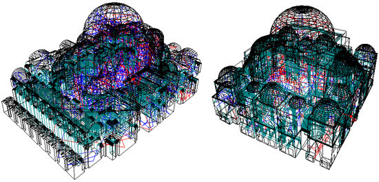 The acoustical simulations of historical structures are carried out in a broader frame of this research by two main methods that are ray-tracing simulations and diffusion equation model (DEM) analysis in a finite element scheme. For applying different estimation methods, the acoustical models of both structures were generated, utilizing the latest building survey registers (röleve) for Hagia Sophia provided by the Turkish Ministry of Culture and Tourism—General Directorate of Turkish Cultural Heritage—and for Süleymaniye Mosque provided by the General Directorate of Pious Foundations. For highlighting the different volumetric relations and major form of the encapsulated interior sound fields, in Figure 9 the ray-tracing models of both structures are presented.