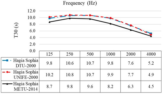 According to METU-2013 measurements, reverberation times for octave bands in between 500 and 4000 Hz have been lowered by different ratios compared to previous years′ test results. The major change is the 2 s of drop at 500 Hz. When T30 values at 250 and 500 Hz are compared for 1988 measurements and 1996–2000 measurements, an increase of 1.5 to 2 s is observed in the latter. In order to be able to explain this increase, the probable undocumented minor-restorations or material changes in between the years of 1988 and 1996 should be known. Another point is that the measurement positions vary in different field tests, so only average values could be compared.