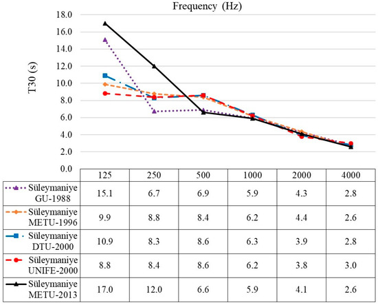 In METU-2013 measurements below 100 Hz, reverberation times reaching 20 s are observed. It is also noted that there are some measurement spots reaching 20 s at 125 Hz in GU-1988 measurements that are excluded from the average as considered to be the highest deviation [43]. The rise in 250 Hz of METU-2013 measurements are due to the very high values of T30 at 200 Hz in the 1/3 octave band. One reason for the deviations among different measurements might also be due to the averaging of 1/3 octaves or only plotting 1/1 octaves. In 1996 and 2000 field tests, T30 values at 125 Hz were measured in between 9 and 11 s, which are much lower than 1988 and 2013 measurements. This result is most probably caused by the insufficient capture/impulse response lengths of the other field tests. For instance, the DTU-2000 measurement set-up uses 10 s of impulse response length, in the real case, which could easily have missed the chance of estimating a longer reverberation time. On the contrary, both of the first measurements taken by GU-1988 with analogue equipment and the final measurements taken by METU-2013 with digital equipment and with an impulse length of 22 s, indicate 15–17 s of T30 values at 125 Hz. Thus, it could be stated that 2007–2011 renovations have not significantly affected the T30 values at 125 Hz, which are still very high and above the acceptable limits for mosque function.