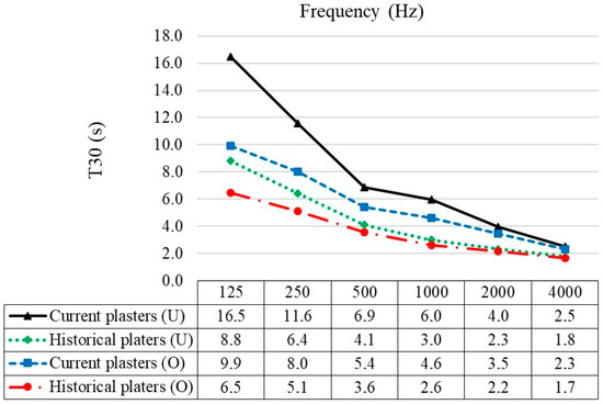 Simulated T30 results of Süleymaniye Mosque Hz in 1/1 octave bands from 125 to 4000 Hz for its current state and trial with historical plasters for unoccupied (U) and unoccupied (O) conditions.