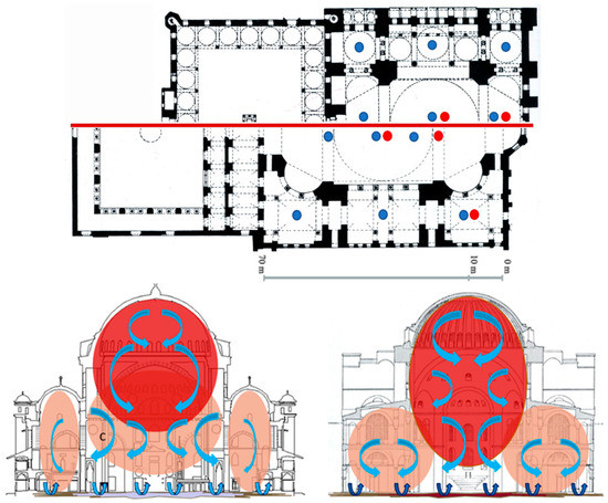 Above: partial plans of Süleymaniye Mosque (above) and Hagia Sophia (below); below: conceptual section view of sound energy flows of Süleymaniye Mosque (on the left) and Hagia Sophia (on the right).