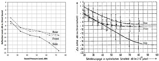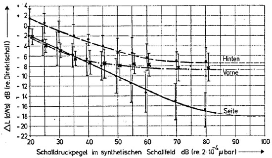 - at listening levels higher than 40 dB, the sensitivity to reflections from the front (“Vorne”) begins to plateau. Sensitivity to reflections from behind (Hinten) plateaus at levels above approximately 60 dB;