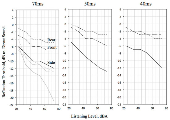 - for all reflection directions, the perception threshold decreases almost linearly with increasing listening level until approximately 40 dB;