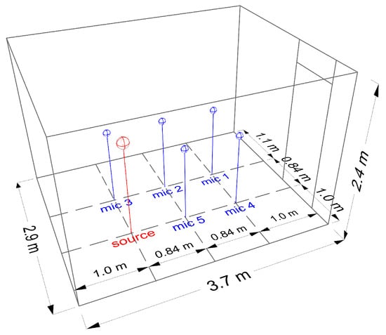 Impulse response measurements were carried out according to ISO 3382-2:2008 [] in an unfurnished room of volume V = 25.2 m having no other use than testing purposes. All measurements were conducted with no people inside the room in a few sessions spread over several days. In order to achieve an appropriate coverage in the room and to account for influences likely to cause differences in reverberation time (RT) throughout the room, one omni-directional class 1 microphone (NTi Audio M2230) placed at a height of 1.2 m was moved between five different and evenly distributed positions across the room. The output of the signal recorded by the microphone was taken by a signal recorder for later analysis. The distance from any microphone position to any reflecting surface of the room and to the source was set to be 1.0 m and 0.84 m, respectively, which complies with the minimum requirement set in the ISO standard []. To make sure that all measurement positions were independent, the minimum distance between two microphones was set to be 0.84 m. Because the room used for conducting the measurements has no other special use than testing purposes, a single source position was used (height was set at 1.5 m). To improve the signal-to-noise ratio, each source-receiver measurement was repeated four times for each room configuration, thus resulting in a total of 4 × 5 = 20 impulse responses to compute for each room configuration. The source and receiver positions, as well as the room dimensions are illustrated in Figure 1.