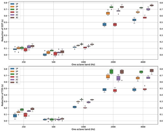Reduction of early decay time (EDT) (top) and T20 (bottom) with respect to the reference per octave band for all the groups.