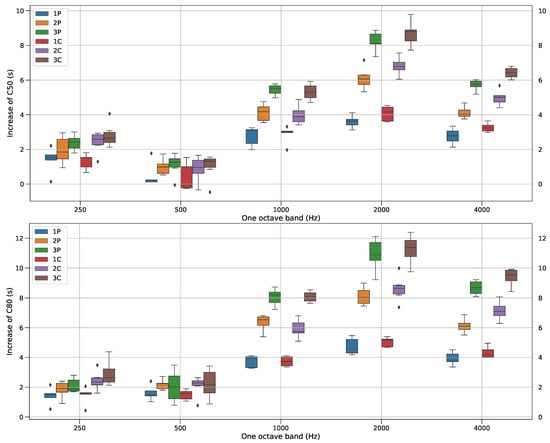 Increase of C50 (top) and C80 (bottom) with respect to the reference per octave band for all the groups.