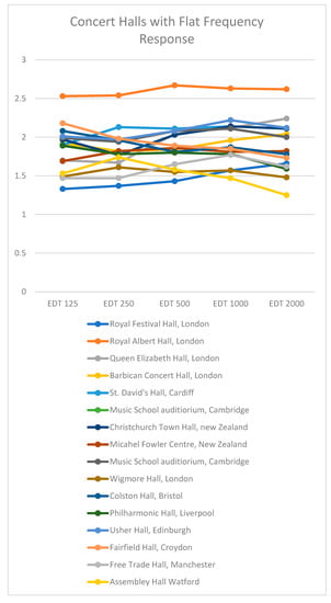 Paphos Theatre has values of EDT that are acceptably flat across a range of frequencies (Figure 6) to an extent that would make it acoustically acceptable for use as a modern concert hall. Indeed, a number of Roman amphitheatres are still in use as concert halls. Most concert halls are enclosed spaces, have a roof, but use wood or carpet for flooring. As an open roofed space, one might expect Paphos Theatre to have lower reverberation, but the stone construction and marble cladding increases reflection strength, extending reverberation time, and the stone seating contributes a stepped range of temporal reflections [47,48]. When compared across the 125 to 2000 Hz range (Figure 7), Paphos has slightly less high frequency EDT than three concert halls, but overall, it has very similar EDT values.