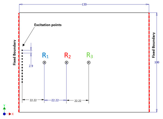 In order to understand and verify the behavior of SAW propagation on a flat plate, a 40 mm thick, 130 mm long, and 100 mm wide plate without any holes or bolts was simulated in a commercially available finite element software, (ANSYS Inc., Release18.1, Canonsburg, PA, USA). The plate is taken as steel with Young’s modulus of 200 Gpa, Poisson’s ratio of 0.33, shear modules of 76.9 Gpa, and density of 7850 kg/m3 [10]. For more consistent meshing control, the top surface was sliced to 3 mm in depth, and then the two slices were consolidated with a bonded contact to be as one part [11]. The incorporation of slices not only allows the localization of a dense mesh for the top surface and less dense mesh along with the remaining thickness of the plate, but it also allows for reducing the computational time to solve the finite element (FE) model since the number of nodes is significantly decreased. Initially, a single nodal point on the upper left surface was selected to represent a single transducer to excite the wave. However, the authors observed that the generated wave is circular which leads to undesirable and non-realistic reflections from the plate sides. These reflections interacted with the incident wave, making the results more complicated to analyze. For this reason, twelve evenly distributed point sources near the upper left end of the plate were selected to excite SAW where each point source represents a single transducer. The generated wave is a straight line when it leaves the source and becomes a curved line as it travels far from the source, similar to our experimental observations. However, large plates necessitate additional point sources to excite a particular wave mode and reduce the noise level [12]. In addition to twelve transmitting point sources, evenly spaced three receivers were introduced to the model. These are nodal points that are located at the top surface of the plate. Both the left and right end of the plate had a fixed boundary condition. Figure 1 illustrates the geometrical details and boundary conditions of the initial verification studies.