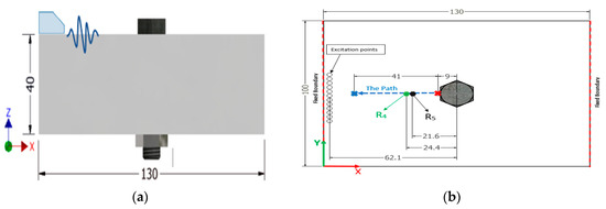 The mesh parameters were selected to characterize the surface wave propagation on the plate surface accurately. In all sets of simulations, the hexahedral element type and tetrahedron element type were chosen for the plate and the bolt respectively. The mesh element size, 2.9 mm, was evaluated using Equation (7) to solve the wave propagation spatially. The mesh quality is a critical aspect in computing and solving the FEA model correctly, and it should be analyzed in each simulation. There are three key mesh statistics can be checked in ANSYS, which are skewness, orthogonal quality, and element quality. In this study, the average value of orthogonal quality, element quality, and skewness were 0.9, 0.84, and 0.1, respectively. The excellent values should be 0.95 for the average orthogonal quality, and 0.3 for element quality, and be less than 0.25 for the average skewness [11]. Figure 3a illustrates the geometry details and Figure 3b shows the top view of the top surface of the plate including the location of the receivers, the excitation points, and the reflected wave propagation path.