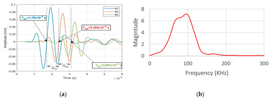 where is the distance between two receivers and is the delay time calculated for the zero-crossing point in the same phase for the two signals, as illustrated in Figure 4. The results of phase velocity that are obtained from Equation (10) and the theoretical phase velocity of the incident signal calculated from Equation (3) are listed in Table 2. It can be observed from the Table 2 that the error between the theoretical and simulated phase velocity is reasonably small (less than 0.4% for all cases studied). Furthermore, to verify the frequency of SAW, fast Fourier transform (FFT) of the obtained signal was taken to convert the time domain of the signal into a frequency domain [27]. Figure 4b illustrates the frequency domain of the signal response at R3. It is worth noting that the central frequency is almost 100 kHz, which is in a good agreement with the central frequency of the incident wave.