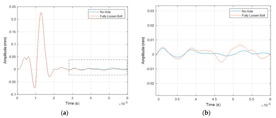 (a) Displacement responses in Z-axis for no hole and fully-loosened bolt cases; (b) Zoomed-in view between the time of 30 and 60 µs for no hole and fully-loosened bolt cases.