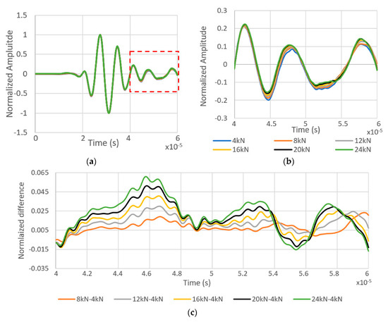 where Ai is the amplitude of each preload, A4kN the reference amplitude (4 kN). It can be noted in Figure 8c that the maximum difference is found at time 46 µs, where the phase shifting of reflected wave occurs.