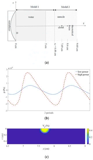 In these Equations, is the resonance frequency of the bubbles (), is the viscous damping coefficient of the bubbly medium ( is the kinematic viscosity of the tissue), is the bubble density in the liquid, , the nonlinear coefficient associated to the adiabatic gas law is , the nonlinear coefficient associated to the dynamic response of bubbles is , and are the initial bubble radius and volume, respectively, and is the specific heat ratio of the gas. The difference between the current total volume and is . Details of the implementation of the model can be found in the previous works [,]. For parameter values used in Model 2, see Figure 1a and Section 3.