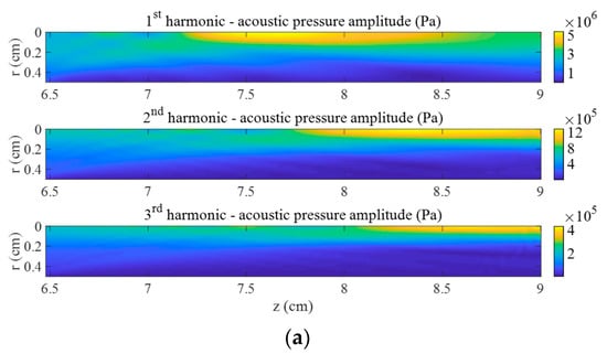First three harmonics of acoustic pressure in the focal area at . (a) Without bubbles and (b) with bubble cloud ().