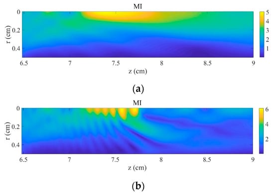 Mechanical index in the focal area at . (a) Without bubbles and (b) with bubble cloud ().