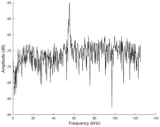 A single audio frame spectrum. Note the prominence of the main vocalization frequency, which essentially makes this type of high-frequency mouse vocalization monochromatic.