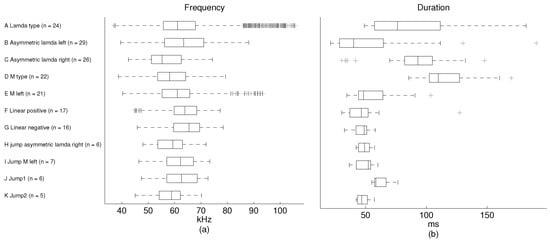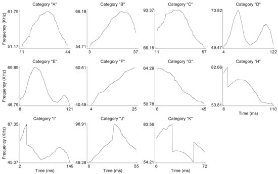 The phonemes fall into two general groups: those presenting some modulation without any pitch jumps and those with one or two pitch jumps. The modulated group is formed by the A–G categories, while the pitch jump group is formed by H–K categories. The number of modulated phonemes (categories A–G) is higher in the sample than the number of phonemes in the pitch jump group (categories H–K). From the mean frequency perspective, it is shown that the values in all categories are found around 60 kHz, except for category J, which has a mean frequency value of 71 kHz. The shortest mean duration of the phonemes is found in category F and the longest in category I. The mean duration is around 60 ms, except for categories D and E, which have longer durations.