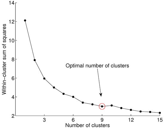 We used the elbow method for finding the optimal number of clusters. First, we compute the sum of squared errors (SSE) for , as shown in Equation (1), and then we look at the values of the SSE across the number of clusters. Typically, the SSE drops significantly as more clusters are added. After the optimal number of clusters for a particular problem is reached, the SSE remains relatively constant.