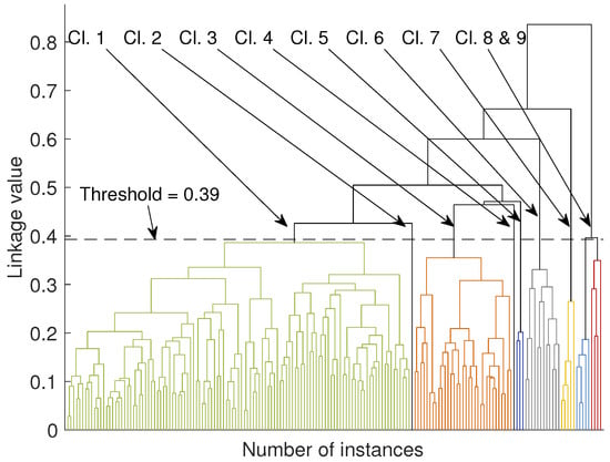 The similarity measure can be any distance, for instance, the Euclidean or Mahalanobis distance. Examples of linkage criteria include the maximum or minimum distances between pairs or other more sophisticated approaches taking into account the probabilities between distributions. A dendrogram derived from our dataset is shown in Figure 6. We elaborate further on the outcome of the agglomerative clustering in Section 3 and Section 4.