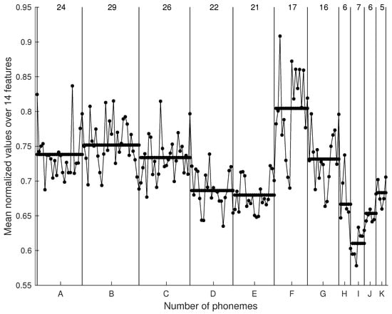 Mean normalized values of the 14 feature vectors in the 11 categories are shown as dots joined with lines, while thick horizontal lines depict the average values of the features in each category. Vertical lines simply separate the different categories, which are indicated by the letters at the bottom, while the figures at the top designate the number of phonemes in each category.