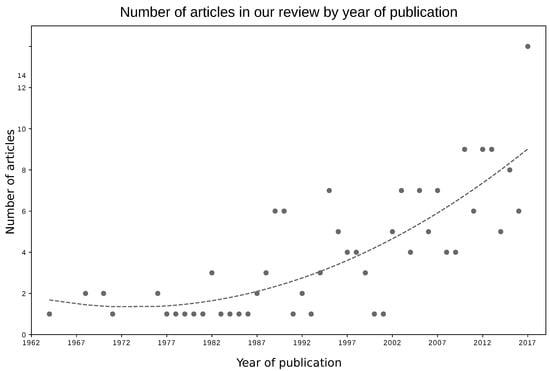 Number of articles per year of publication that succeeded our screening and met our inclusion criteria: Regression was evaluated using a 2nd-degree least square polynomial fit.
