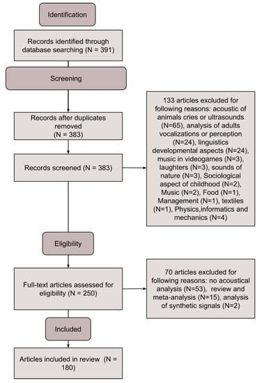 An electronic database search on Elseviers’ Scopus was conducted in March 2018, using the query “Acoustic* Cry”. This query was selected to identify all articles that contain any derivation of the stem acoustic and the word cry in the title or body of the article, and therefore, all articles where acoustical properties of cry were under investigation. Scopus returned 391 results. After automatic duplicate removal, 383 articles remained and were manually inspected for inclusion in the current review. One of the authors (G.G.) screened article titles and abstracts to exclude irrelevant articles. A total of 133 articles were excluded as irrelevant to this review. The remaining 250 articles were then examined by two independent coders to determine which articles met all four inclusion criteria, namely (1) analysis of samples were recorded from infants or from prerecorded datasets; (2) data collection procedure is explained or there is a clear reference to the employed dataset; (3) indications of the methodology used for signal processing is reported; and (4) the article was peer-reviewed and written in English. Seventy-seven articles were excluded because they did not meet the four inclusion criteria. A detailed representation of this screening procedure is given in Figure 2. The final dataset consists of 180 articles. Two independent coders (average between-coder agreement = 84%, evaluated on a subset of 20 randomly selected articles) who were blind to the aim of the review analyzed the included 180 and coded each for the presence of the 18 variables.