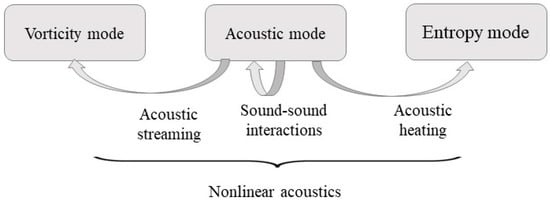 In linear wave motion, disturbances in a medium can be defined as the result of three independent modes: the acoustic, entropy, and vorticity modes [2,8]. If wave intensity increases, the disturbances in a medium becomes large enough such that nonlinear wave propagation starts [3,7]. The nonlinear elastic behavior of the materials becomes progressively more important at high-amplitude wave excitation [3,9]. As the speed of the disturbance (or particle velocity) increases, linear wave motion ceases, and therefore the superposition principle is no longer valid. Thus, the disturbance cannot be described in the form of the three independent modes [8]. These modes start interacting with one another. As shown in Figure 1, the following three interactions between these modes are activated due to high-intensities: the sound-sound, sound-vorticity and sound-entropy interactions [2,8]. Due to the sound-sound interactions, harmonic generations and self-demodulations occur within the acoustic mode [2,8]. Then, the acoustic mode starts to interact with the other two modes, and this interaction induces acoustic heating and generation of hydrodynamic flow [8].
