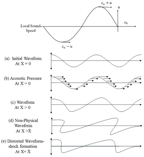 This transition from the linear regime to a nonlinear corresponds to a change in the local wave propagation from to , as shown in Figure 2. The sections of the waveform with higher propagate faster than those with lower This accumulation of the nonlinear effects in the waveform leads to variation (or deviation) in the propagation speed of different segments of the waveform (Figure 2c) resulting in distortion of the sinusoidal wave and increasing steepness of the wavefront (Figure 2d). Eventually, these distortions result in a shock formation represented by an N-wave (Figure 2e) [3,7,10]. At the shock, the jump condition forms, and the medium undergoes an abrupt and nearly discontinuous change in the pressure, density, and temperature [2,4,10]. The shock formation corresponds to the first appearance of infinitely steep waveform regions associated with the N-wave. The critical distance is the distance propagated by an acoustic wave in an ideal medium when the infinite slope first appears in the waveform [7].