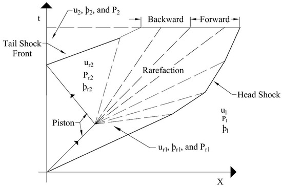 Based on the above discussion, for a head shock overtaken by the forward part of rarefaction , the resulting flow field can be evaluated using Equations (19) and (20):