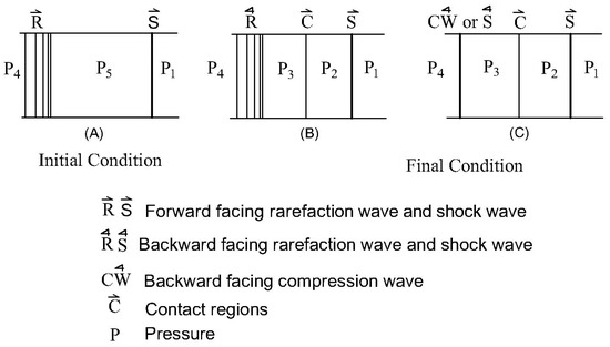 Figure 5 shows (A), the overtaking of a shock by a weak rarefaction wave and the flow field resulting from this interaction can result in (B) a transmitted shock wave with a reflected rarefaction or (C) a transmitted shock with a reflected wave that can be a shock, with a contact region between the reflected and transmitted waves. As this transmitted wave decays with interactions, its strength decreases, and the entropy diminishes. Glass et al., 1959 presented algebraic equations relating the pressure ratio across the transmitted and reflected wave (at the end of interactions) to the known values of pressure ratios across the incident shock and overtaking rarefaction wave (before interactions) [15]. When the overtaking rarefaction wave is weak, the interaction results in a reflected rarefaction wave, the quasi-steady flow in regions and can be evaluated using expressions Equations (19) and (20) [14]. Here, the reflected compression wave (case II, Figure 5C) was tactically assumed. Hence, it would not influence the terminal states and can be neglected [15]. Case III and case IV mentioned above correspond to the strong overtaking rarefaction wave and they do not pertain to our discussion. Thus, in the case of a weak rarefaction wave overtaking a shock wave, the resulting flow field or terminal state will consist of a transmitted shock and a reflected rarefaction wave (case I, Figure 5B). The pressure jump across it can be evaluated using Equations (19) and (20).