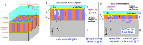 Figure 1. 1-3 epoxy-filled lead zirconate titanate (PZT) piezocomposite transceiver: (a) general view; (b) structure for the conventional thickness resonance mode; (c) structure for the novel Surface Acoustic Wave (SAW) resonance mode on backing of the same operation frequency.