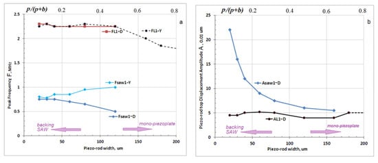 The backing parameters are presented in Table 2, so that for a total backing height H 4 mm, with periodicity (pitch) 250 µm, it provides a longitudinal backing resonance much lower of 100 kHz. Both the fundamental (lowest) backing SAW and longitudinal piezo-rod resonance frequencies are relatively stable versus piezo-rod width, as shown in Figure 2a. For the backing SAW resonance, it has a broader peak bandwidth for wider rods.