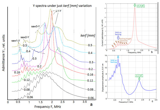 Figure 4. Simulated spectra (admittance IYI, continuous wave (CW)) transformation under composite piezo-rod structural variation: (a) just kerf variation (pillar width 50 μm); (b,c) – comparative peak amplitudes admittance and top rod displacement (pitch 250 μm and pillar 50 μm), respectively; rod length 0.76 mm in the structure of just piezo-rods on backing.